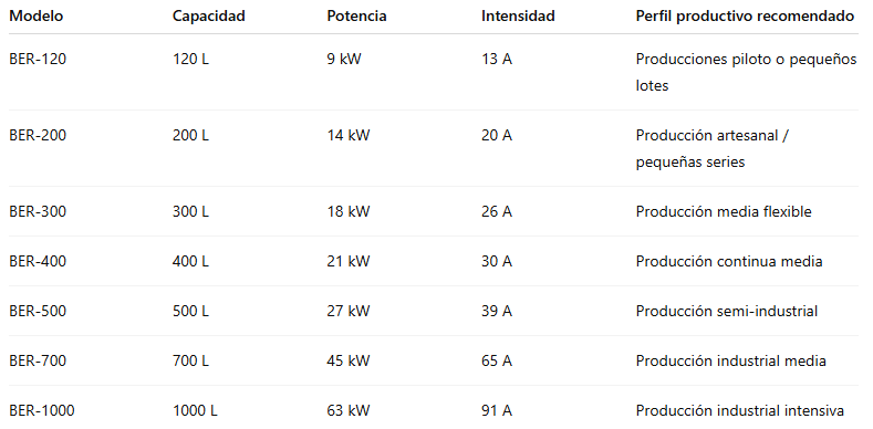 La gama cubre capacidades desde 120 hasta 1000 litros, permitiendo seleccionar el equipo más adecuado según el proceso productivo.